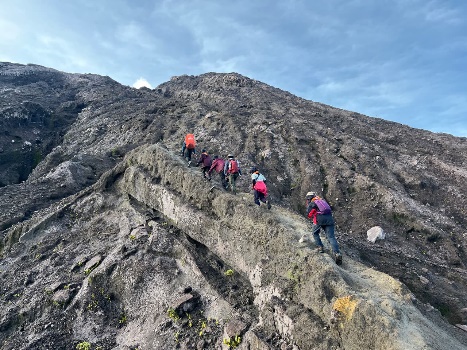 Jalan menuju puncak adalah jalur maut karena kanan-kiri adalah jurang. Lebar jalur kurang lebih setengah meter dan sedikit berpasir. Ketelitian, kesabaran, dan kerja sama sangat dibutuhkan. Di tengah jalan, ketika berbalik, kita akan melihat pemandangan yang luar biasa yaitu deretan pegunungan Jawa Timur seperti Gunung Semeru, Argopuro, Ijen, Kawah Wurung, Kawah Ilalang. Setelah berhenti beberapa kali, akhirnya kami berhasil tiba di puncak. Kaldera Raung nampak jelas di depan mata. Memiliki kedalaman hingga 500 meter, kaldera ini merupakan kaldera kering yang terbesar di Pulau Jawa dan terbesar kedua di Indonesia setelah Gunung Tambora di Nusa Tenggara Barat.
